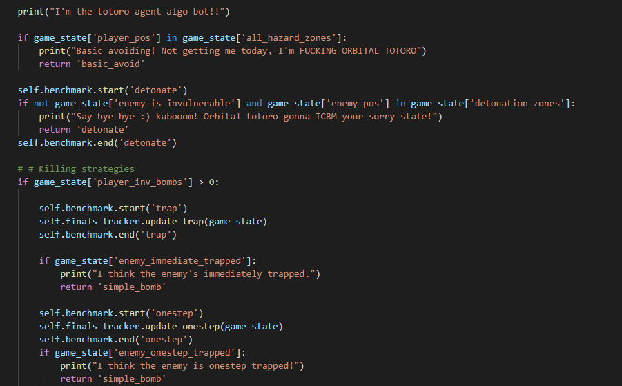 Even then, there were clear optimisations that we could make in terms of speed, so Silent began timing and setting benchmarks for each strategy, execution, etc. After the team enhanced the functionality of algo-bot to be a better killer, have some rudimentary zoning mechanism, better avoidance of hazards, etc. we submitted that one as our final bot.